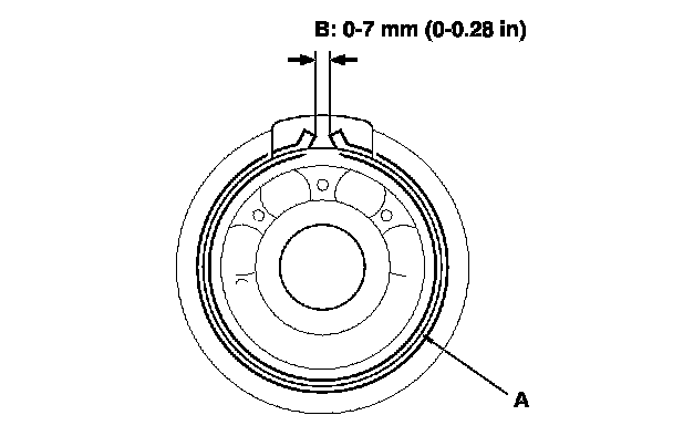 6. After installing the bearings, check that the snap rings (A) are seated in the bearing and the transmission housing grooves, and that the snap ring end gaps (B) are correct.