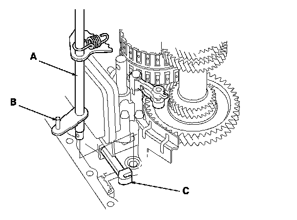 7. Install the selector control shaft (A) in the torque converter housing aligning the manual valve lever pin (B) on the selector control shaft with the guide of the manual valve (C). Pull the manual valve gently when aligning the manual valve with the selector control shaft.