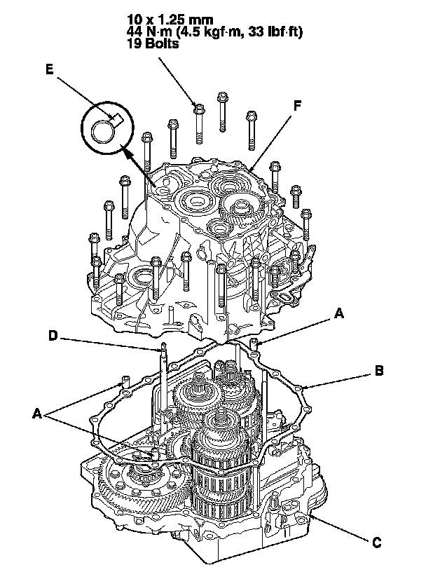 18. Install the transmission housing mounting bolts, and tighten the 19 bolts to 44 N-m (4.5 kgf-m, 33 lbf-ft) in at least two steps, in a crisscross pattern.