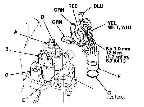 21. Install the shift solenoid wire harness (F) in the transmission housing with a new O-ring (G).