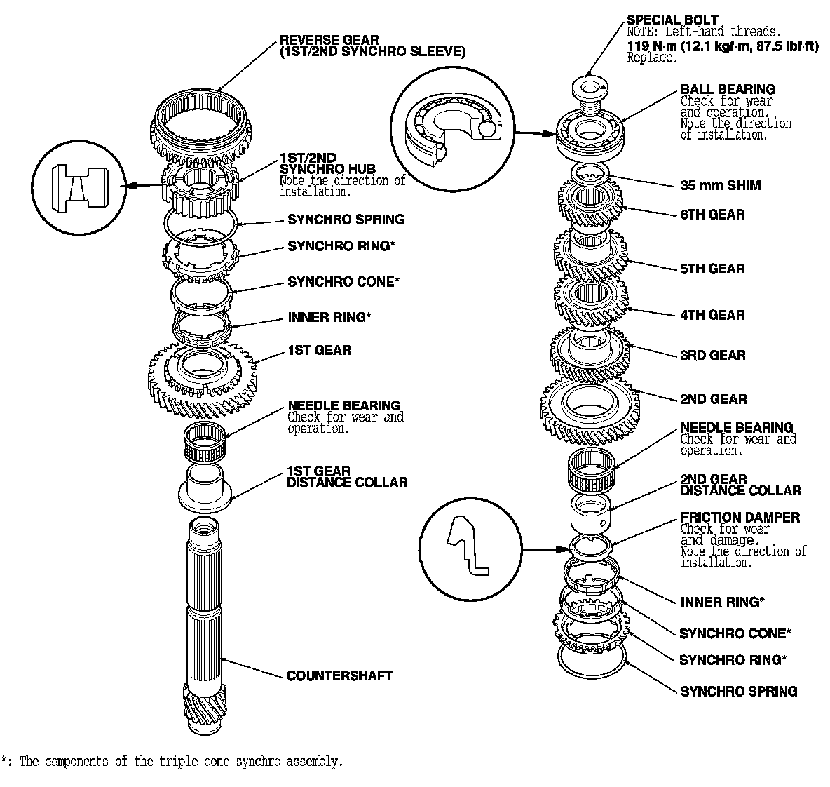 17. Remove 6th gear with the ball bearing and the 35 mm shim using a press. M/T Countershaft Disassembly