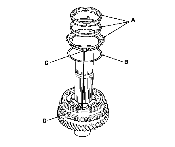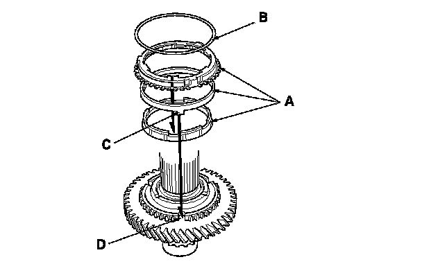 6. Install the triple cone synchro assembly (A) with the synchro spring (B) by aligning the synchro ring fingers (C) with the grooves (D) in the 1st/2nd synchro hub.
