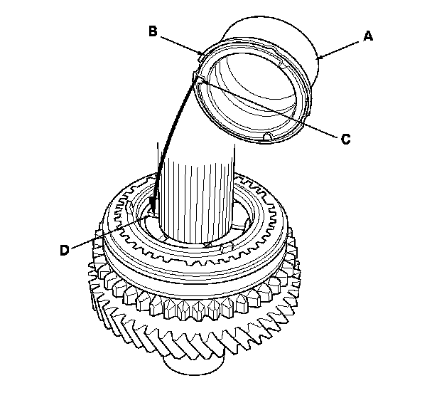 3. Install the triple cone synchro assembly (A) with the synchro spring (B) by aligning the synchro cone fingers (C) with the grooves (D) in 1st gear.