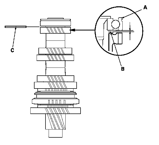 15. Measure the clearance between the ball bearing (A) and the 35 mm shim (B) with a feeler gauge (C).