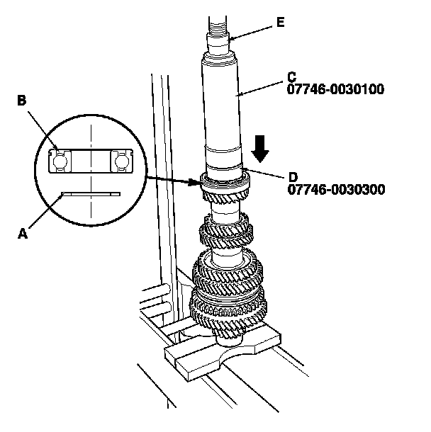 19. Install the correct 35 mm shim (A) and a new ball bearing (B) using the 40 mm inner driver handle (C), the 30 mm inner bearing driver attachment (D), and a press (E).