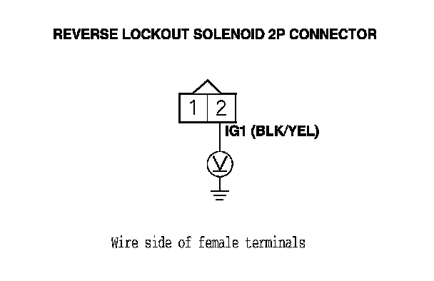 8. Measure the voltage between reverse lockout solenoid 2P connector terminal No. 2 and body ground.