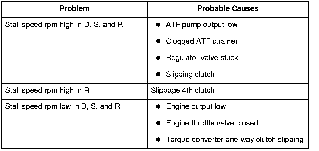 9. If the stall speeds are out of the service limit, problems and probable causes listed in the table.