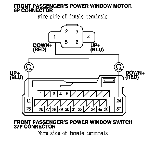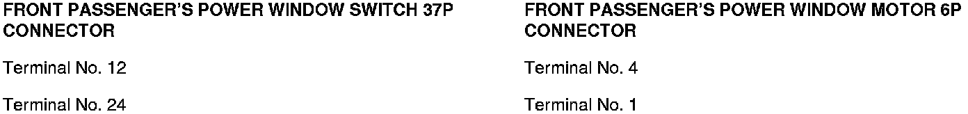 6. Check for continuity between front passenger's power window switch 37P connector terminals No. 12 and No. 24, and front passenger's power window motor 6P connector terminals No. 1 and No. 4 respectively. There should be continuity.