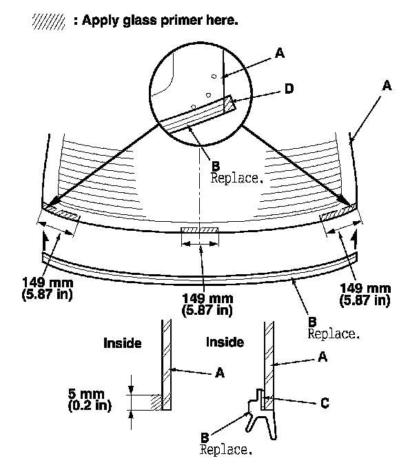 - Apply the glass primer to the corner areas of the rear window using the printed dots (C) on the rear window as a guide.