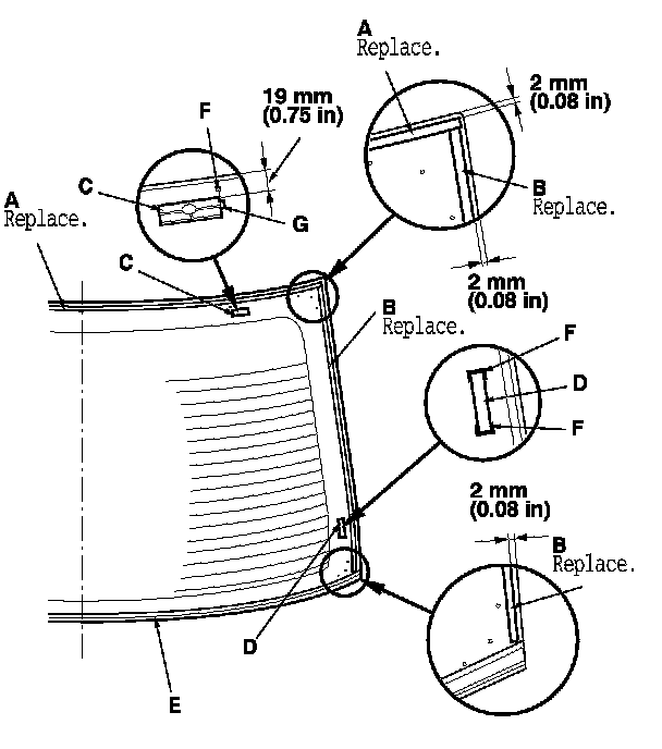 9. Scrape smooth the old adhesive with a knife until there is a thickness of about 2 mm (0.08 in) on the bonding surface around the entire rear window opening flange: