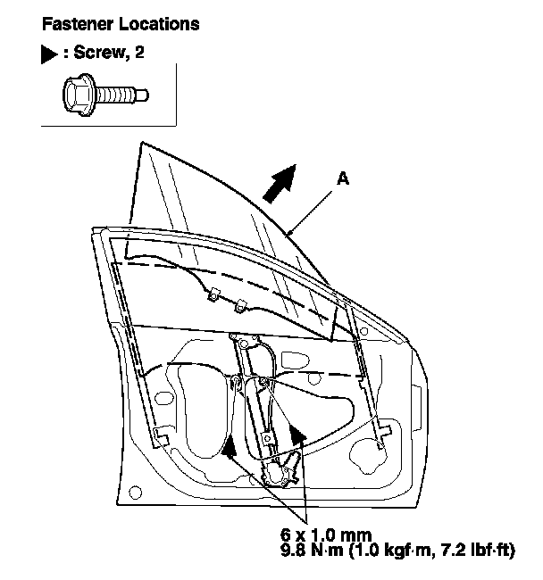 6. Carefully lower the glass (A) until you can see the bolts, then remove them. Carefully pull out the glass through the window slot. Take care not to drop the glass inside the door.