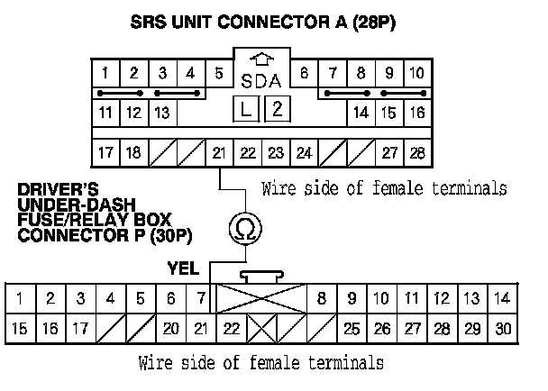 8. Measure the resistance between SRS unit connector A (28P) terminal No. 21 and under-dash fuse/relay box connector P (30P) terminal No. 21. There should be 0-1.0 Ohms.