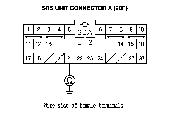 9. Measure the resistance between SRS unit connector A (28P) terminal No. 21 and body ground. There should be an open circuit or at least 1 MOhms.