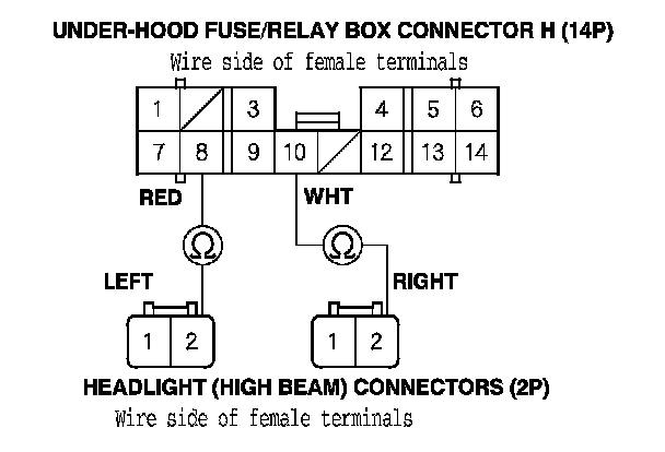 13. Check for continuity between left headlight high beam 2P connector terminal No. 2 and under-hood fuse/relay box connector H (14P) terminal No. 8, and between right headlight high beam 2P connector terminal No. 2 and under-hood fuse/relay box connector H (14P) terminal No. 10.