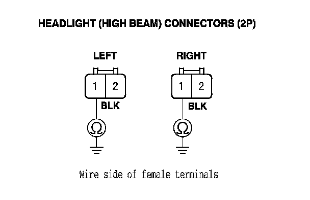 14. Check for continuity between each headlight high beam 2P connector terminal No. 1 and body ground.