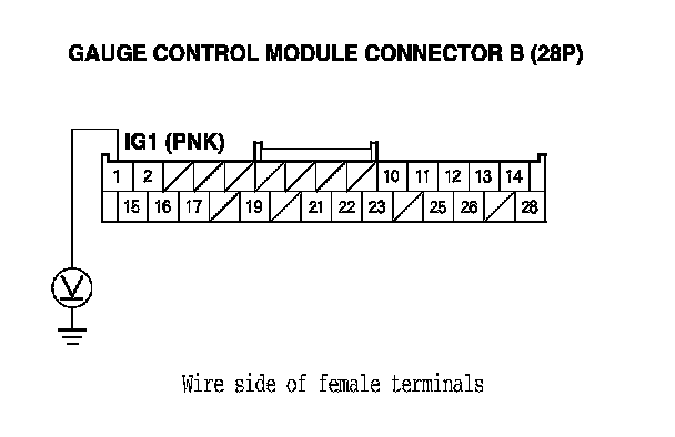 10. With gauge control module connector B (28P) still connected, measure the voltage between terminal No. 1 and body ground.