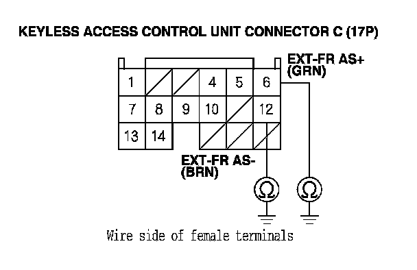 8. Check for continuity between body ground and keyless access control unit connector C (17P) terminals No. 6 and No. 12 individually.