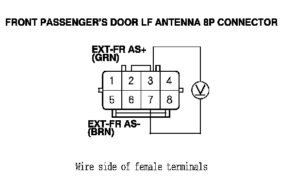 10. Connect the voltmeter between front passenger's door LF antenna 8P connector terminals No. 3 and No. 7.