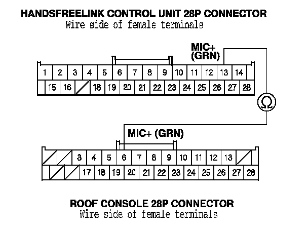 11. Check for continuity between the HandsFreeLink control unit 28P connector terminal No. 13 and the roof console 28P connector terminal No. 6.