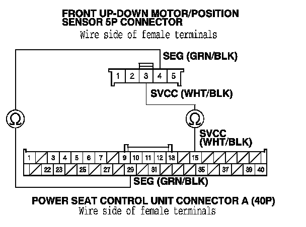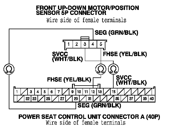 13. Check for continuity between power seat control unit connector A (40P) terminals No. 12, No. 15, and No. 29 and front up-down motor/position sensor 5P connector terminals No. 3, No. 4, and No. 5 respectively.