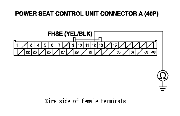 14. Check for continuity between power seat control unit connector A (40P) terminal No. 12 and body ground.