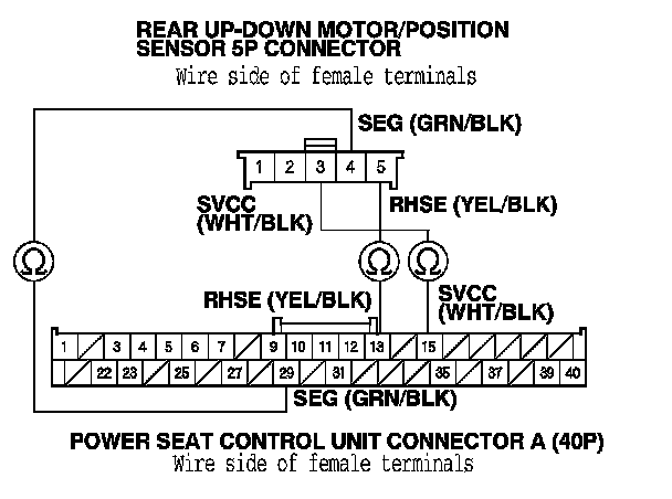 13. Check for continuity between power seat control unit connector A (40P) terminals No. 13, No. 15, and No. 29 and rear up-down motor/position sensor 5P connector terminals No. 3, No. 4, and No. 5 respectively.