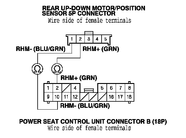 28. Check for continuity between power seat control unit connector B (18P) terminals No. 2 and No. 10 and rear up-down motor/position sensor 5P connector terminals No. 1 and No. 2 respectively.