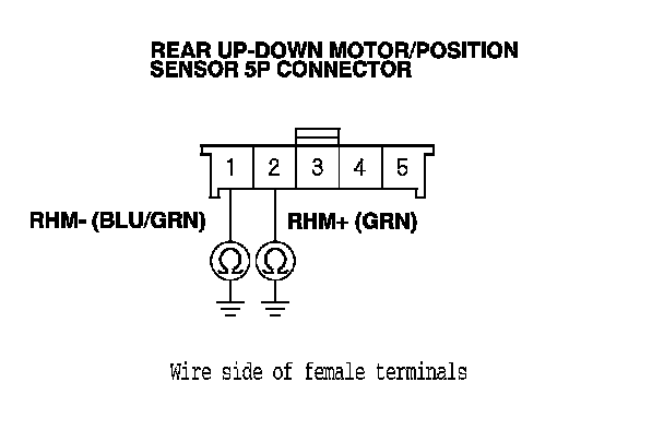 29. Check for continuity between body ground and rear up-down motor/position sensor 5P connector terminals No. 1 and No. 2 individually.