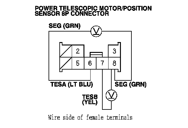 16. Measure the voltage between power telescopic motor/position sensor 8P connector terminals No. 6 and No. 8 and between terminals No. 7 and No. 8.