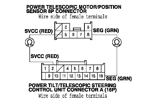 20. Check for continuity between power tilt/telescopic steering control unit connector A (16P) terminals No. 2 and No. 16 and power telescopic motor/position sensor 8P connector terminals No. 5 and No. 8 respectively.