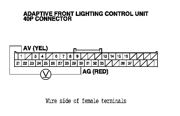 12. Measure the voltage between body ground and adaptive front lighting control unit 40P connector terminals No. 21 and No. 22 individually.