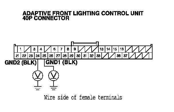 13. Measure the voltage between body ground and adaptive front lighting control unit 40P connector terminals No. 24 and No. 25 individually.