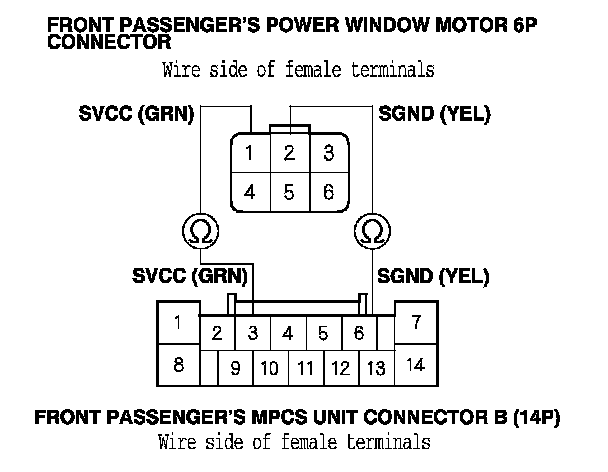 15. Check for continuity between front passenger's MPCS unit connector B (14P) terminals No. 3 and No. 6 and the front passenger's power window motor 6P connector terminals No. 1 and No. 2 respectively.
