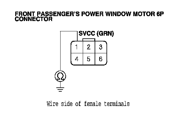 16. Check for continuity between front passenger's power window motor 6P connector terminal No. 1 and body ground.