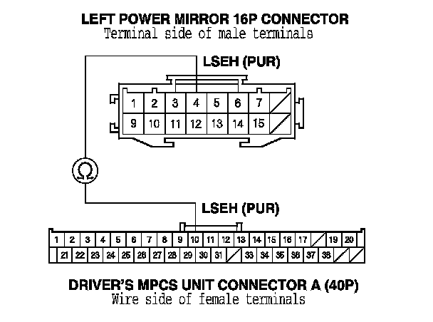 10. Check for continuity between driver's MPCS unit connector A (40P) terminal No. 10 and left power mirror 16P connector terminal No. 4.