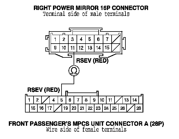 10. Check for continuity between front passenger's MPCS unit connector A (28P) terminal No. 5 and right power mirror 16P connector terminal No. 11.