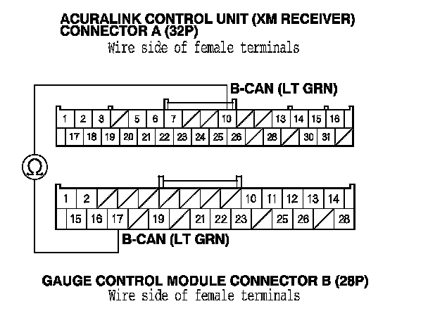 6. Check for continuity between AcuraLink control unit (XM receiver) connector A (32P) terminal No. 10 and gauge control module connector B (28P) terminal No. 17.