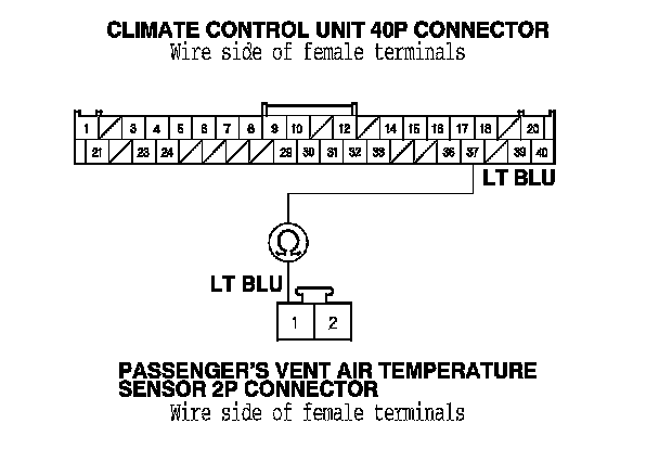 8. Check for continuity between climate control unit 40P connector terminal No. 37 and passenger's vent air temperature sensor 2P connector terminal No. 1.