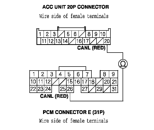 8. Check for continuity between ACC unit 20P connector terminal No. 10 and PCM connector E (31P) terminal No. 15.