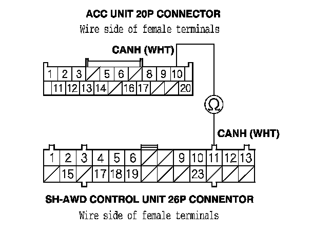 9. Check for continuity between ACC unit 20P connector terminal No. 20 and SH-AWD control unit 26P connector terminal No. 10.