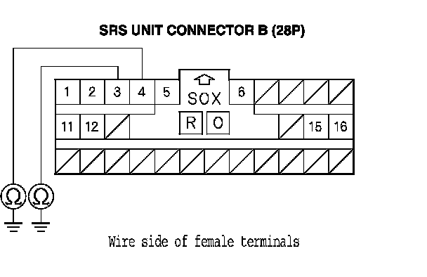 14. Measure the resistance between SRS unit connector B (28P) terminal No. 3 and body ground, and between terminal No. 4 and body ground. There should be an open circuit or at least 1 MOhms.