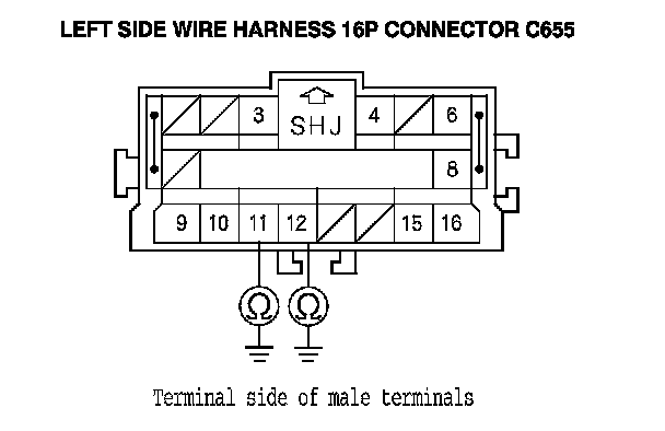 16. Measure the resistance between left side wire harness 16P connector C655 terminal No. 11 and body ground, and between terminal No. 12 and body ground. There should be an open circuit or at least 1 MOhms.