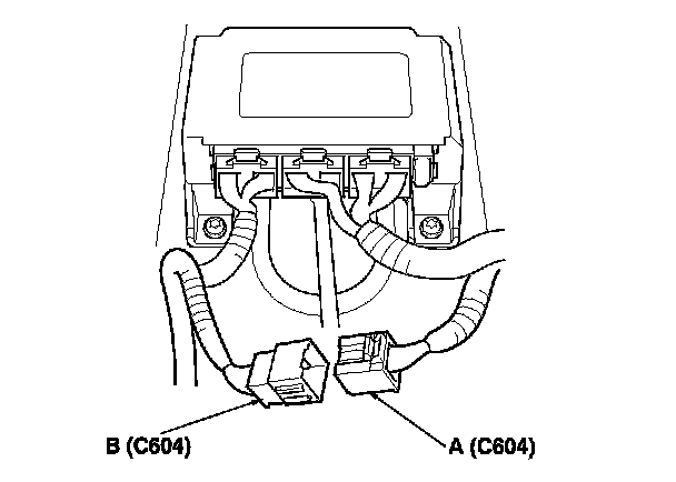 17. Disconnect right side wire harness 16P connector C604 (A) from left side wire harness connector C604 (B).
