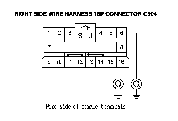 18. Measure the resistance between right side wire harness 16P connector C604 terminal No. 6 and body ground, and between terminal No. 8 and body ground. There should be an open circuit or at least 1 MOhms.
