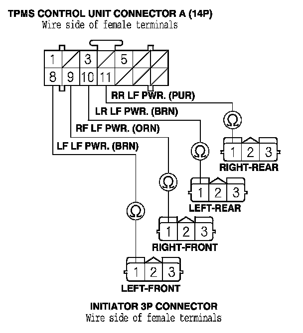 26. Check for continuity between the appropriate TPMS control unit connector A (14P) terminal and appropriate initiator 3P connector terminal No. 1 (see table).
