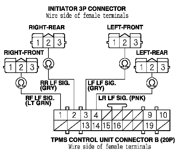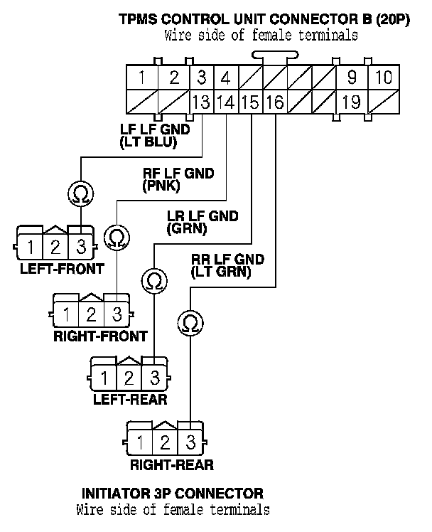 28. Check for continuity between the appropriate TPMS control unit connector B (20P) terminal and appropriate initiator 3P connector terminal No. 2 (see table).