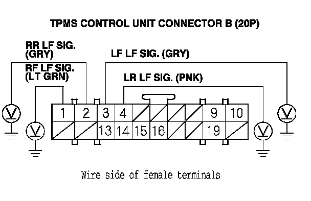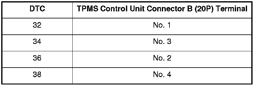 31. Measure the voltage between body ground and the appropriate TPMS control unit connector B (20P) terminal (see table).