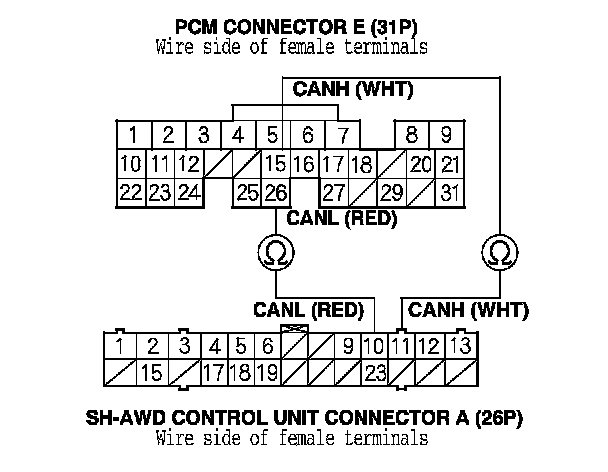 10. Check for continuity between PCM connector terminals E15, E26 and SH-AWD control unit connector terminals A10, A11 individually.