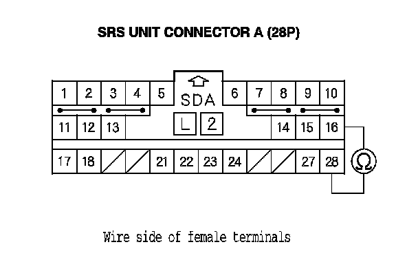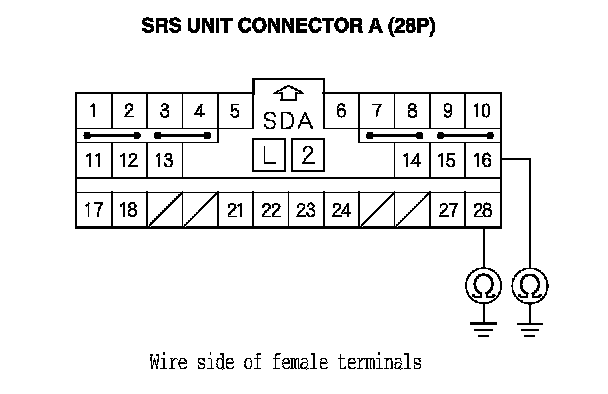 15. Measure the resistance between SRS unit connector A (28P) terminals No. 16 and No. 28. There should be less than 1.0 Ohms.