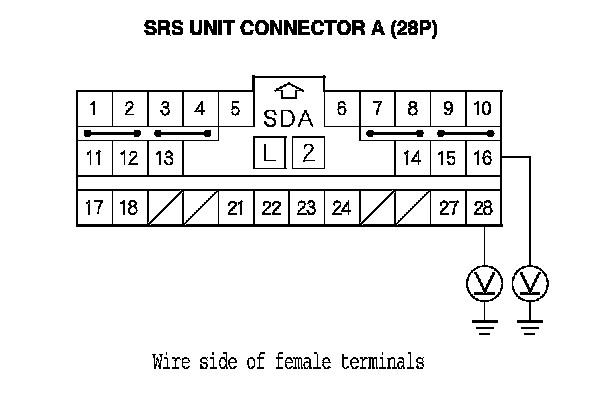 12. Measure the voltage between SRS unit connector A (28P) terminal No. 16 and body ground, and between terminal No. 28 and body ground. There should be less than 0.2 V.